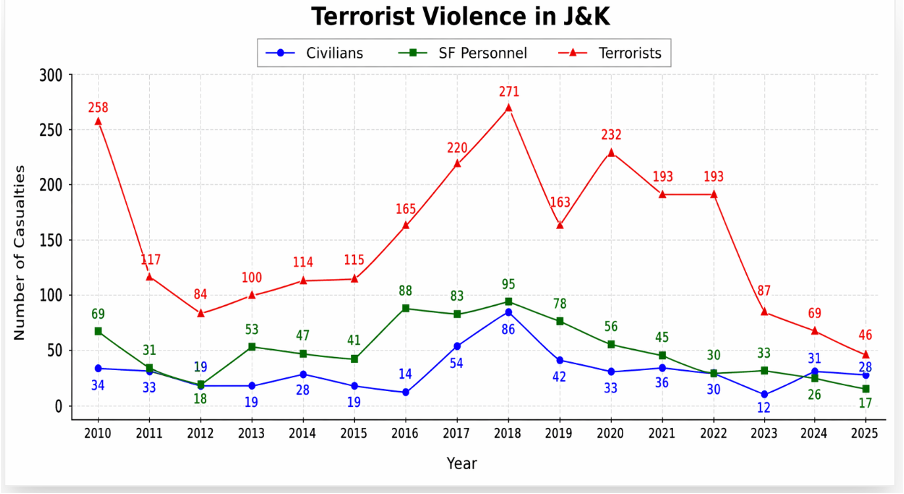 The period leading up to the terrorist attack in Baisaran was marked by a remarkable return to normality in Jammu and Kashmir. The repeal of Article 370 in 2019, together with development and security measures, has reshaped the security landscape in the Union Territory of Jammu and Kashmir (see the table below). This return to normality triggered the Baisaran attack. It was difficult for the terrorists and their sponsors to accept that civil society had largely rejected them. After the attack, the revulsion against the terrorists was so strong that The Resistance Front (TRF), an affiliate of Lashkar-e-Taiba, which initially claimed responsibility, swiftly issued a denial. Disenchantment with the Islamist terrorists, their sponsors in Pakistan, and the separatist elements within the Valley was a severe rebuke to all anti-India elements.